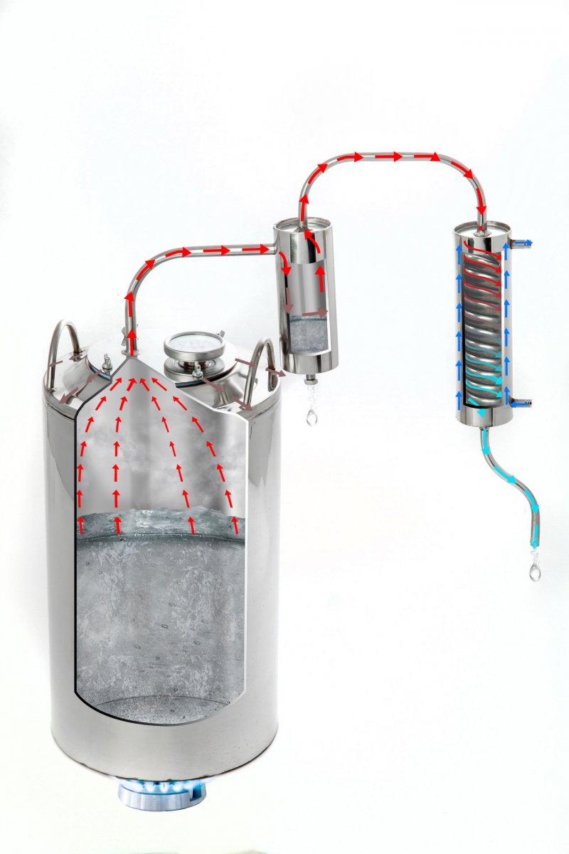 Сухопарник несомненно является преимуществом позволяющим отбирать большую часть сивушных масел еще до выхода готовой продукции. Позволяет выполнить слив сивушных масел, при наполнении и по окончанию работы, сливать содержимое необходимо через сливной кран расположенный в нижней части сухопарника.